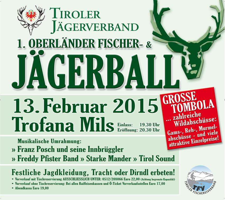 Unter der Federführung der Bezirke Imst und Landeck, und unter der Patronanz des Tiroler Jägerverbandes, findet am Freitag, den 13. Februar 2015 der 1. Oberländer Fischer- & Jägerball in der Trofana in Mils bei Imst statt.